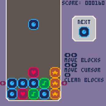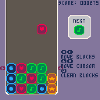 Only horizontal sequences of 2 or more blocks of the same color will disappear. The more blocks, the more points! If you clear 4 or more of the same color in a row, all consecutive blocks of that color (starting from the first one ot the same side) will also disappear on the rows above and below.